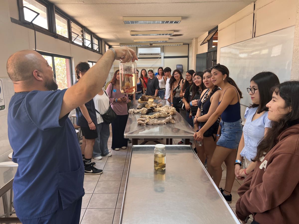 La jornada continuó con un recorrido guiado por diferentes docentes: Dra. Nicole Butto, Dr. André Rubio, Dr. Cristián Torres, Dr. Nicolás Galarce y Dr. Ricardo Riquelme. La ruta incluyó el Hospital de Animales Pequeños, el Pabellón de Anatomía, la Sala de Necropsia, el Área Deportiva, el Laboratorio de Farmacología Veterinaria Farmavet y Mundo Granja.